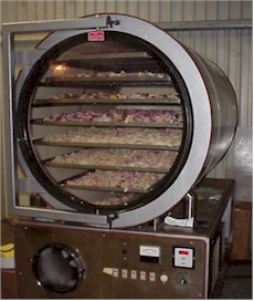 When you freeze rose petals, the water forms ice crystals which can then be sublimated into water vapor. The petals start in a large chamber chilled to -20 F. A deep vacuum is pulled on the tube with another freeze chamber in between the large chamber and the vacuum pump. The middle freeze change is kept at -60 F. The ice crystals become airborne water vapor in the first chamber then are sucked through the second chamber. The second chamber is so cold that the airborne water vapors get stuck to the side. (Kind of like when you stuck your lips on a cold flag pole as kid.) The technical term is Lyophilization. No the process of freeze drying, not the lips on the flagpole thing. That is called Youthful Exuberance.
